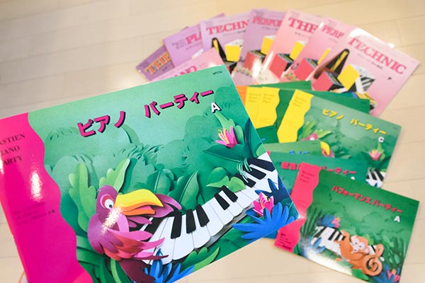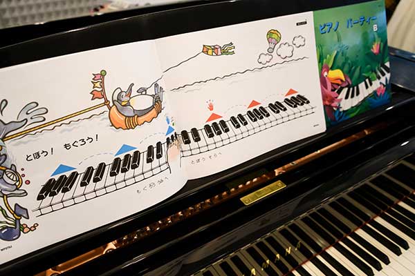 小さいお子様向けにはバスティンメソッドを採用しています。絵本を読みながらいろんな音を楽しみます。最初は手をグーにして黒鍵を叩くことで、手首が折れない理想的な手の形を癖づける効果もあります。