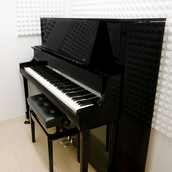 2階のレッスン室(Room2)には、ヤマハのアップライトピアノ・YU33があります。背が高く迫力のあるサウンドが特徴です。特殊な吸音パネルによる音響空間も合わせてお楽しみください。