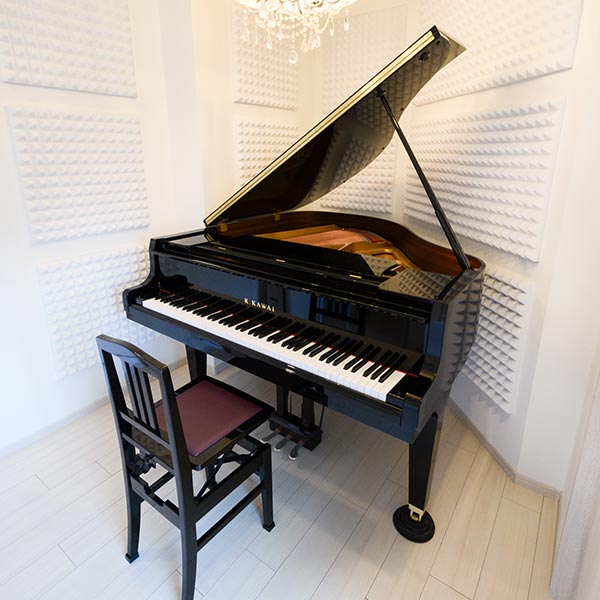 2階のレッスン室(Room1)には、カワイのグランドピアノ・GL-10があります。小型ながら、フルコンサートグランドピアノのような驚くほど軽やかなタッチで、特に小さな音の響きがすばらしいです。